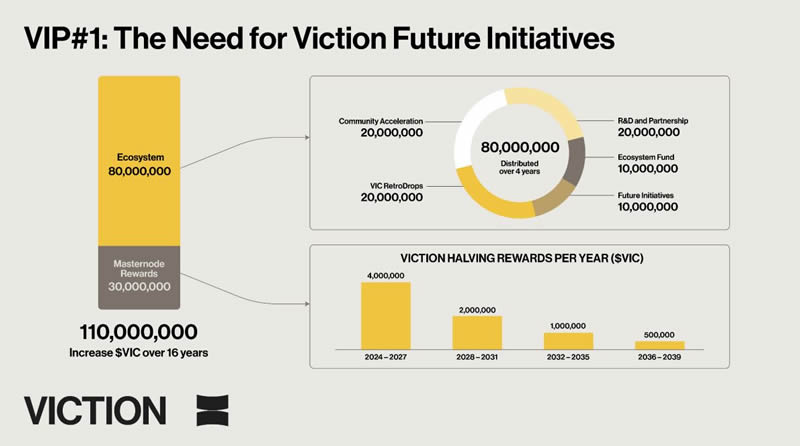 VIC最大供应量为2.1亿枚,采用平衡分配策略:1200万枚分配给创始团队(4年解锁),1600万枚用于生态建设,1700万枚作为区块奖励。2024年10月硬分叉新增1.1亿枚,其中3000万枚用于主节点激励,8000万枚支持生态发展。持有者可通过质押参与治理,前150名主节点候选人将获得验证交易资格。