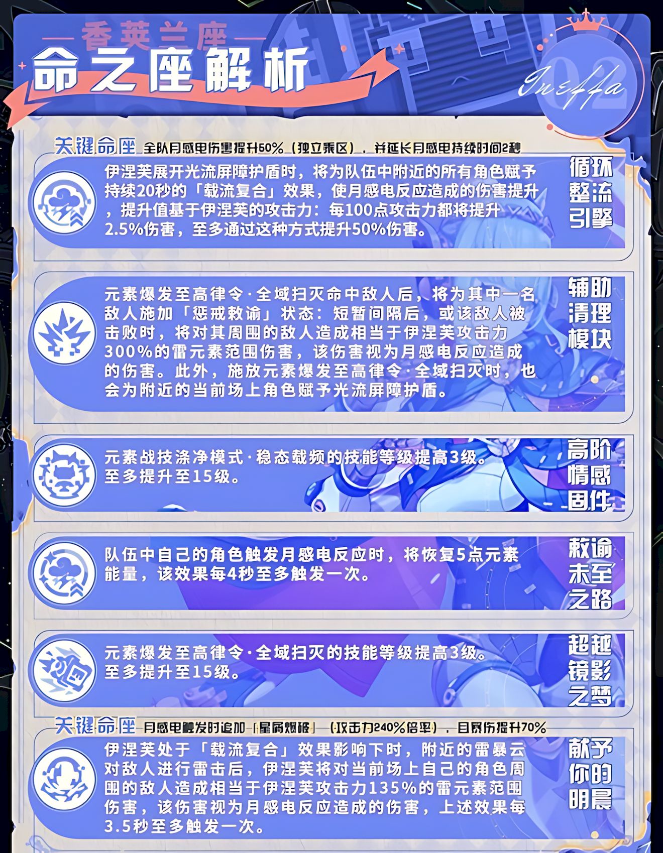 2、命座关键效果显著,1命开盾赋予队友载流复合增伤,4命触发月感电可恢复元素能量,6命提升雷暴云相关范围伤害强化实战表现。