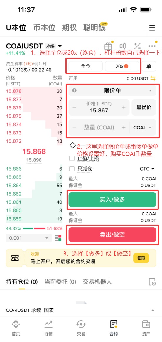 投资者可通过币安等平台交易COAI永续合约,最高支持20倍杠杆。需注意: