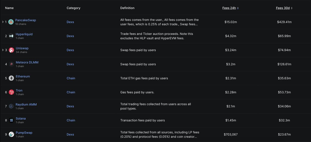Hyperliquid产生的费用超过了以太坊和Solana | 来源:DefiLlama
