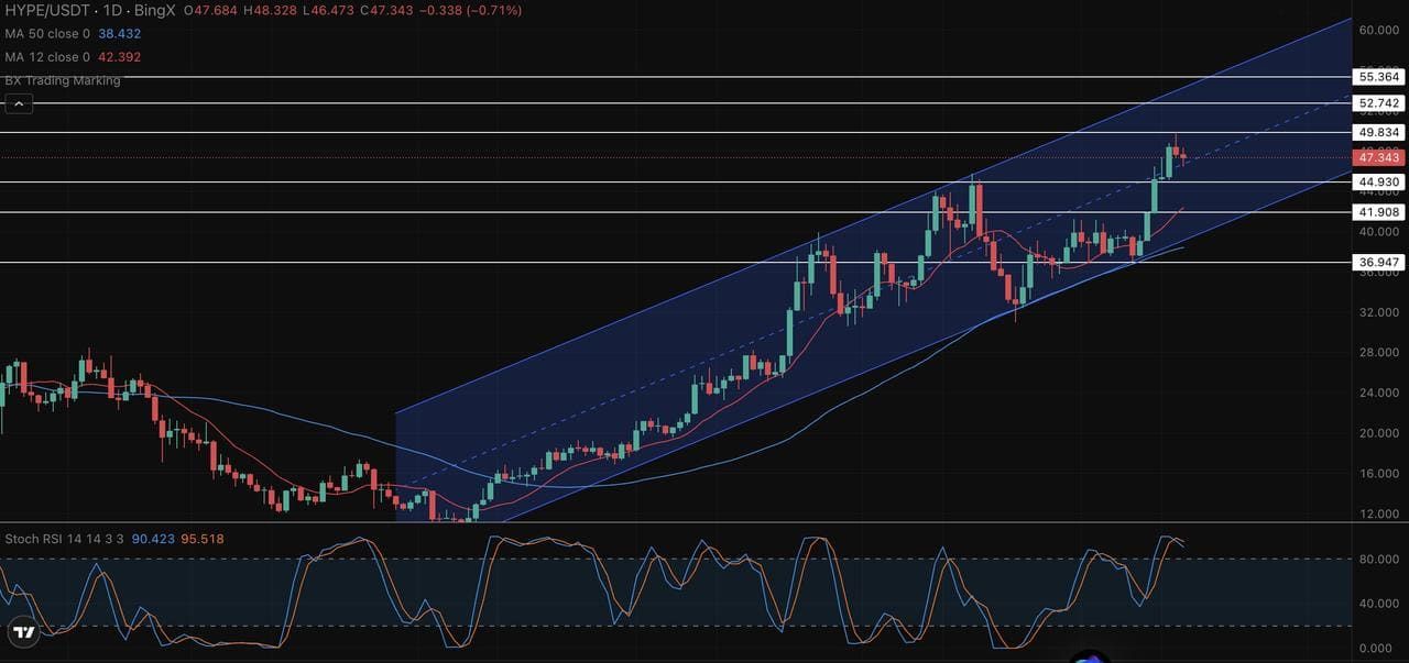 HYPE/USDT保持上升通道运行,12日与50日均线构成动态支撑。随机RSI虽显示超买,但在强势趋势中可能持续。关键阻力位49.83美元若突破,将打开通往52.74美元的空间。