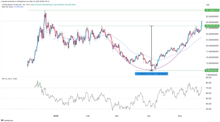日线显示HYPE自4月低点$9.36持续上涨,突破$28.4关键阻力位。当前$35.07价格保持50日均线上方,RSI指标显示健康上涨动能。短期目标位$46,需关注11月开始的每日216,580枚代币解锁影响。