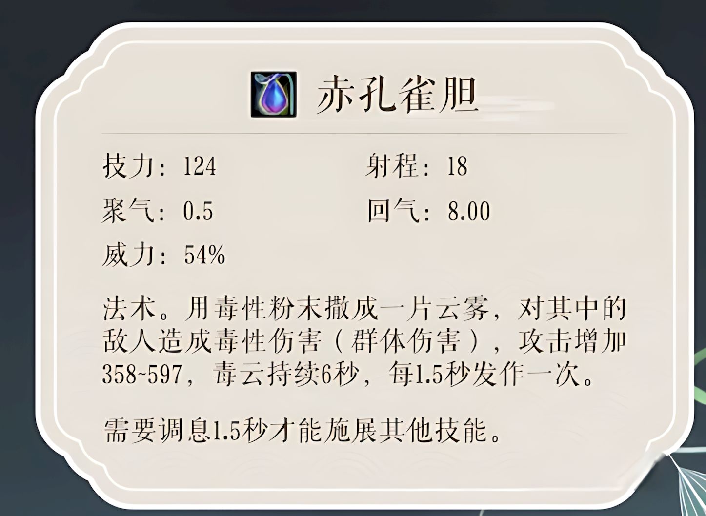 3、主流连招以葬花起手控场,衔接赤孔雀胆与毒云扩大中毒范围,穿插断肠腐骨草维持持续伤害,兼顾控制与输出效率。