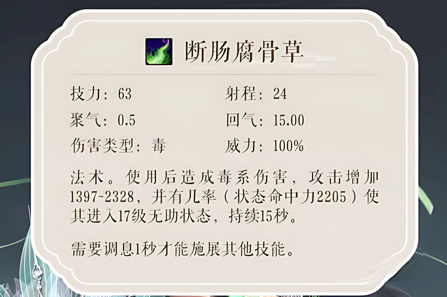 2、核心技能各有侧重,葬花有强制眩晕控制效果,赤孔雀胆造成群体毒伤,断肠腐骨草伤害高额且概率附加无助状态。
