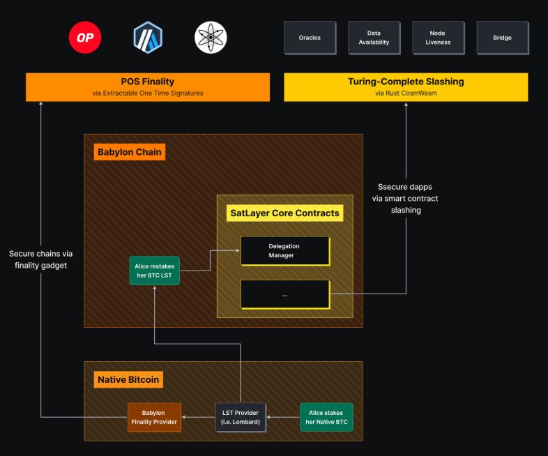 SatLayer基于Babylon协议构建,通过CosmWasm智能合约实现可编程罚没机制。相较于Babylon的基础安全层,SatLayer支持自定义惩罚规则,能保护预言机、跨链桥等复杂应用。