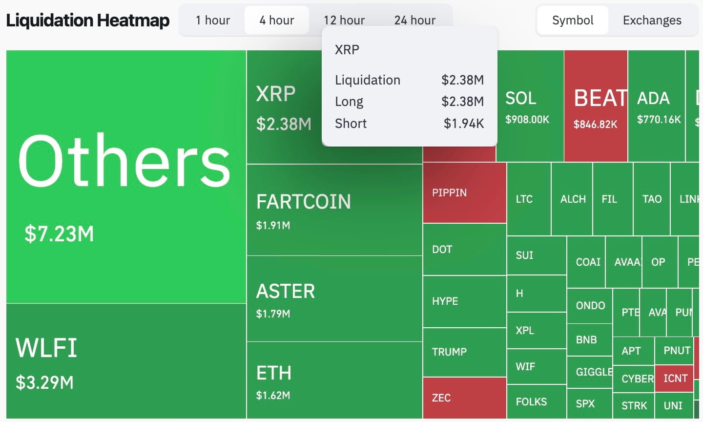 更大范围的热力图显示这是精准狙击,而非全市场崩盘。其他币种以723万美元清算额领跑,WLFI达329万美元,而XRP的238万美元清算额高于FARTCOIN(191万美元)、ASTER(179万美元)、ETH(162万美元)及SOL(约90.8万美元)。