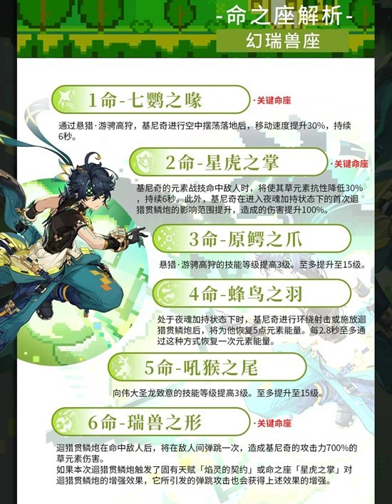 2、命座关键效果突出1命提升落地移速2命降敌草抗并增伤6命让攻击弹跳,3命5命分别提升元素战技和爆发等级,4命提供元素能量恢复。