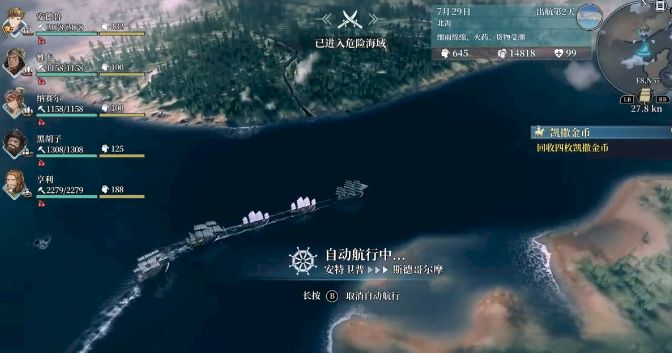 2、第三枚金币需从马德拉群岛向西航行固定距离,发现沉船残骸后靠近拾取,表面已受海水长期腐蚀,第四枚需抵达斯德哥尔摩西南区域触发忠犬事件。