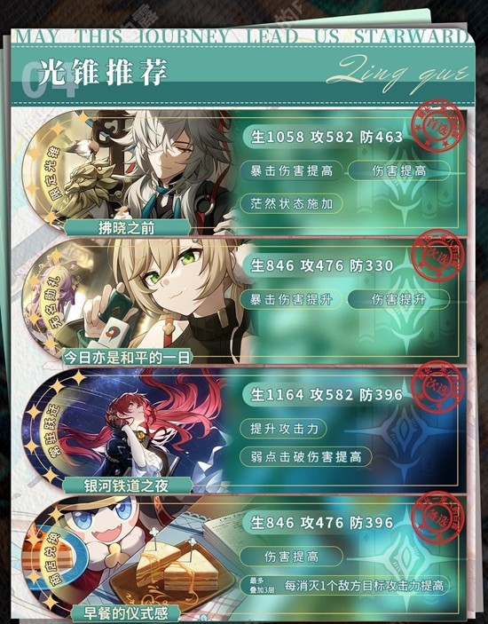 3、光锥推荐拂晓之前今日亦是和平的一日银河铁道之夜早餐的仪式感,侧重提升暴击伤害攻击力或弱点击破伤害等关键战斗属性。