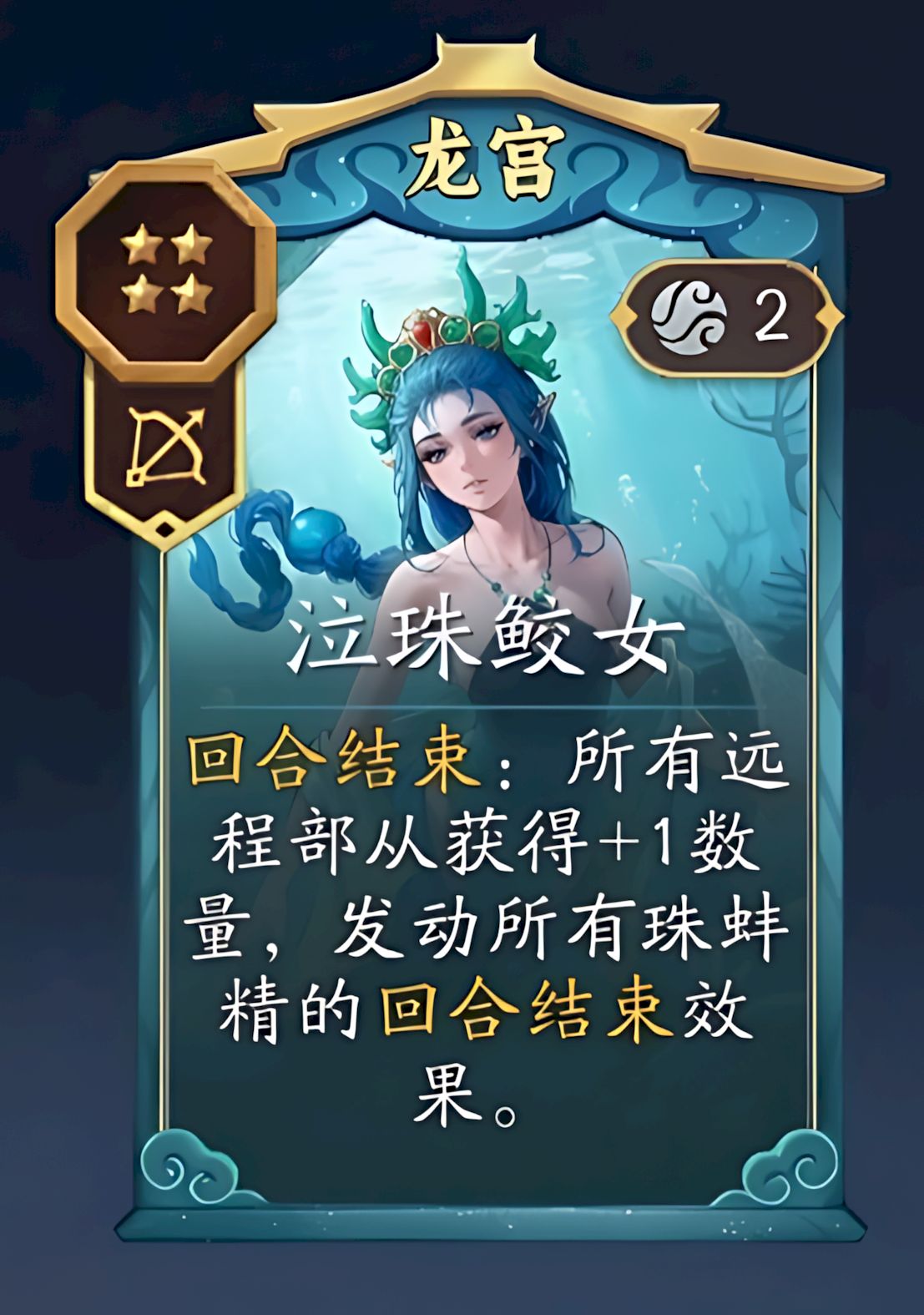 2、核心部从包含二本珠蚌精四本泣珠鲛女六本珠泪天女,三者效果联动,每回合结束均能为远程部从增数并触发前置部从效果。