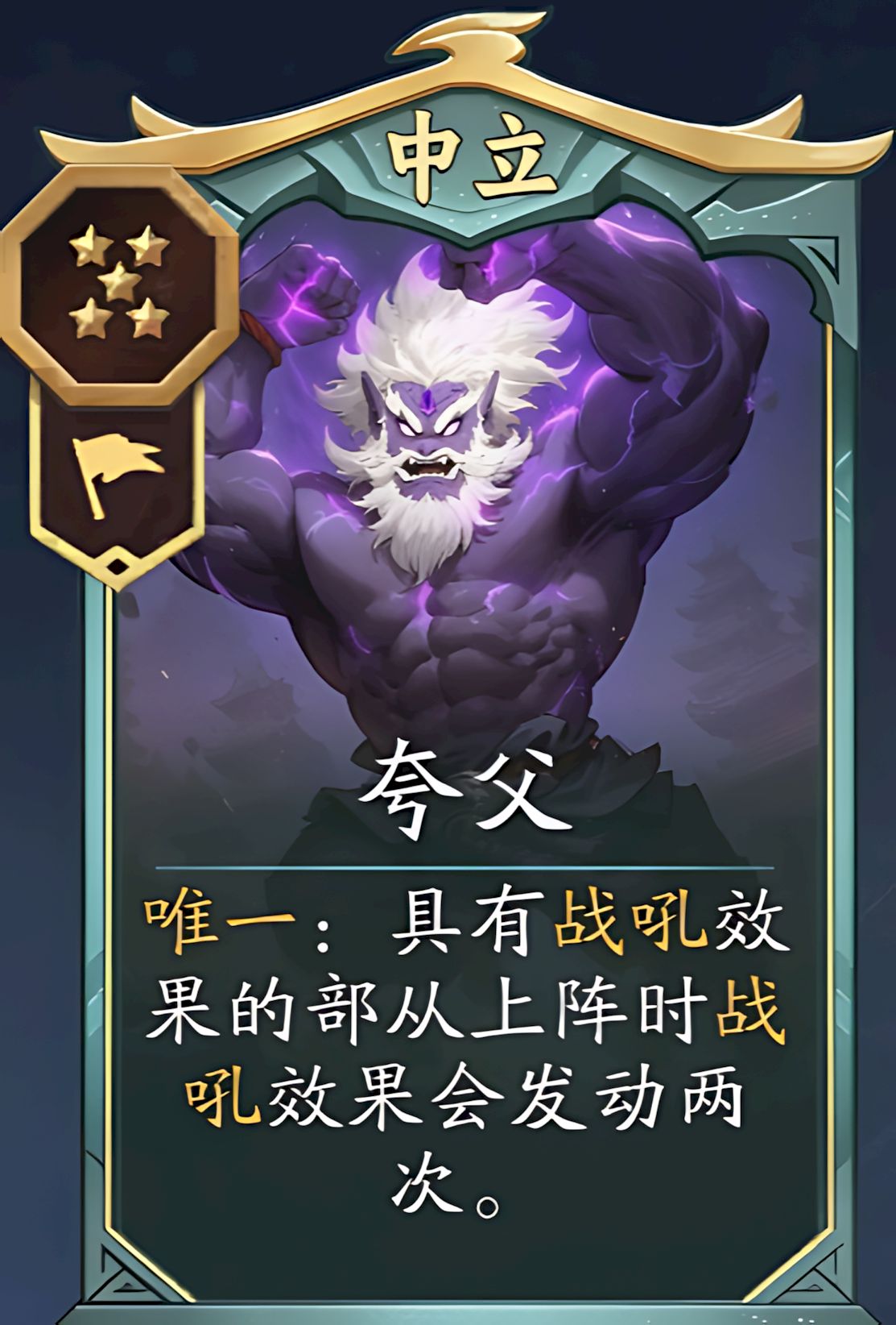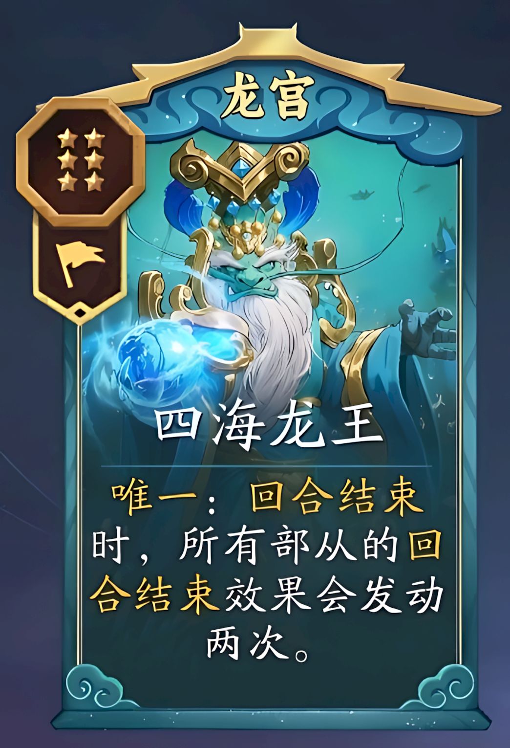 3、后期可搭配四海龙王与夸父拉高上限,四海龙王让所有部从回合结束效果发动两次,夸父强化战吼类部从效果触发频次。