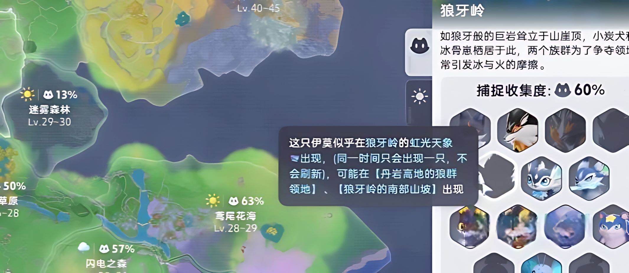 4、闪电貂普通形态分布于鲸落浅滩右侧石碓附近,虹光形态需进化解锁并击败对应头目,同时触发虹光天气。