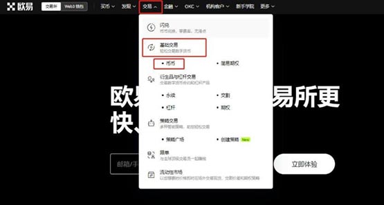 4、登录后选择"交易-基础交易-币币"功能模块进入交易界面。