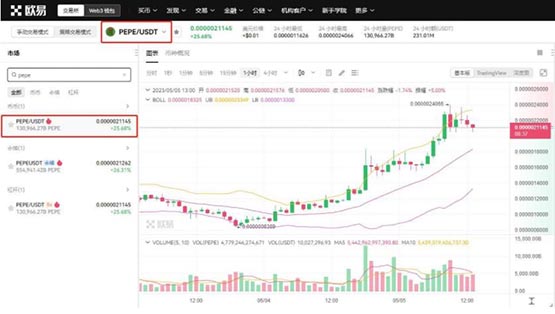 5、搜索目标币种PEPE,查看PEPE/USDT交易对的实时市场数据。