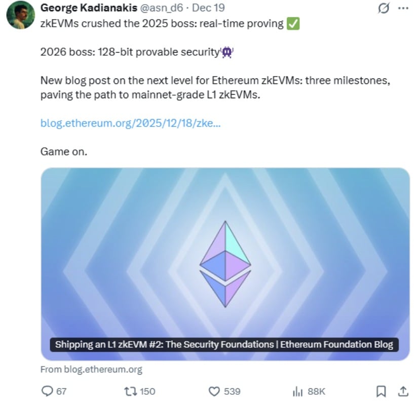 在实现过去一年显著的性能提升后,以太坊基金会为zkEVM团队设定了三个必须在2026年底前完成的关键安全里程碑。