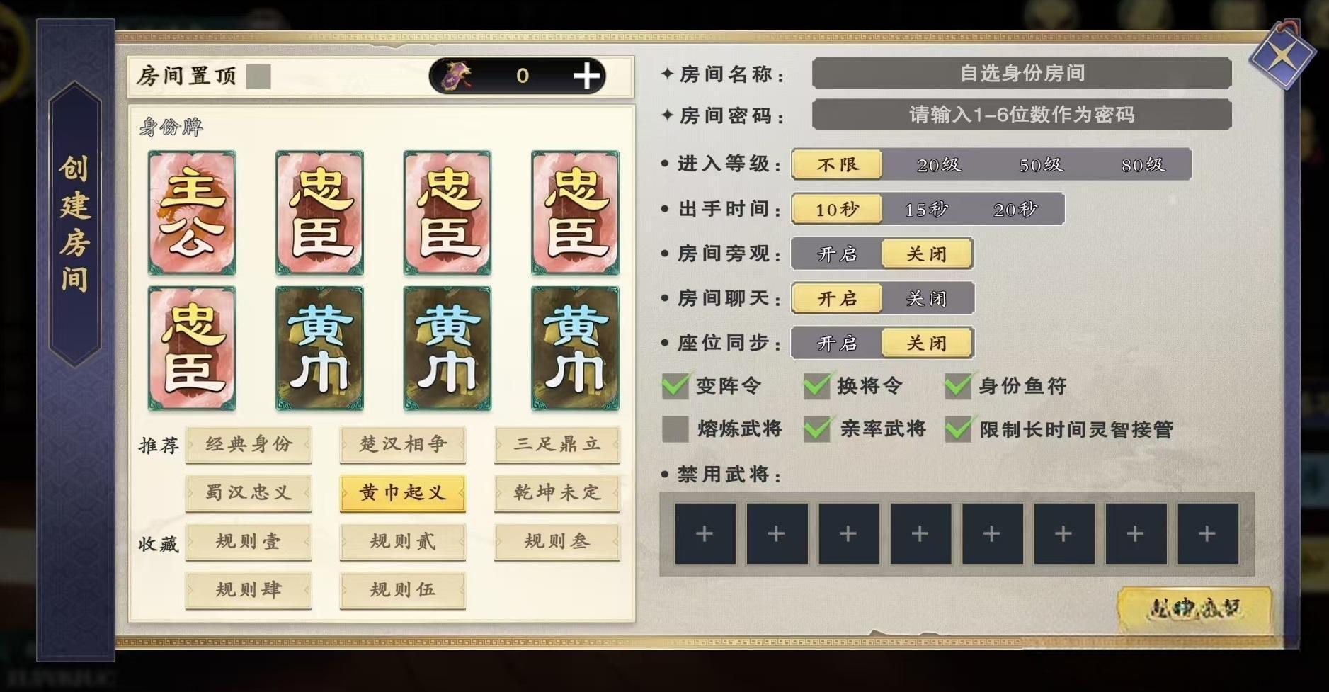 1、创建房间时选择推荐中的黄巾起义,系统自动分配身份牌,可自定义密码出手时间旁观权限及进入等级等基础设置。