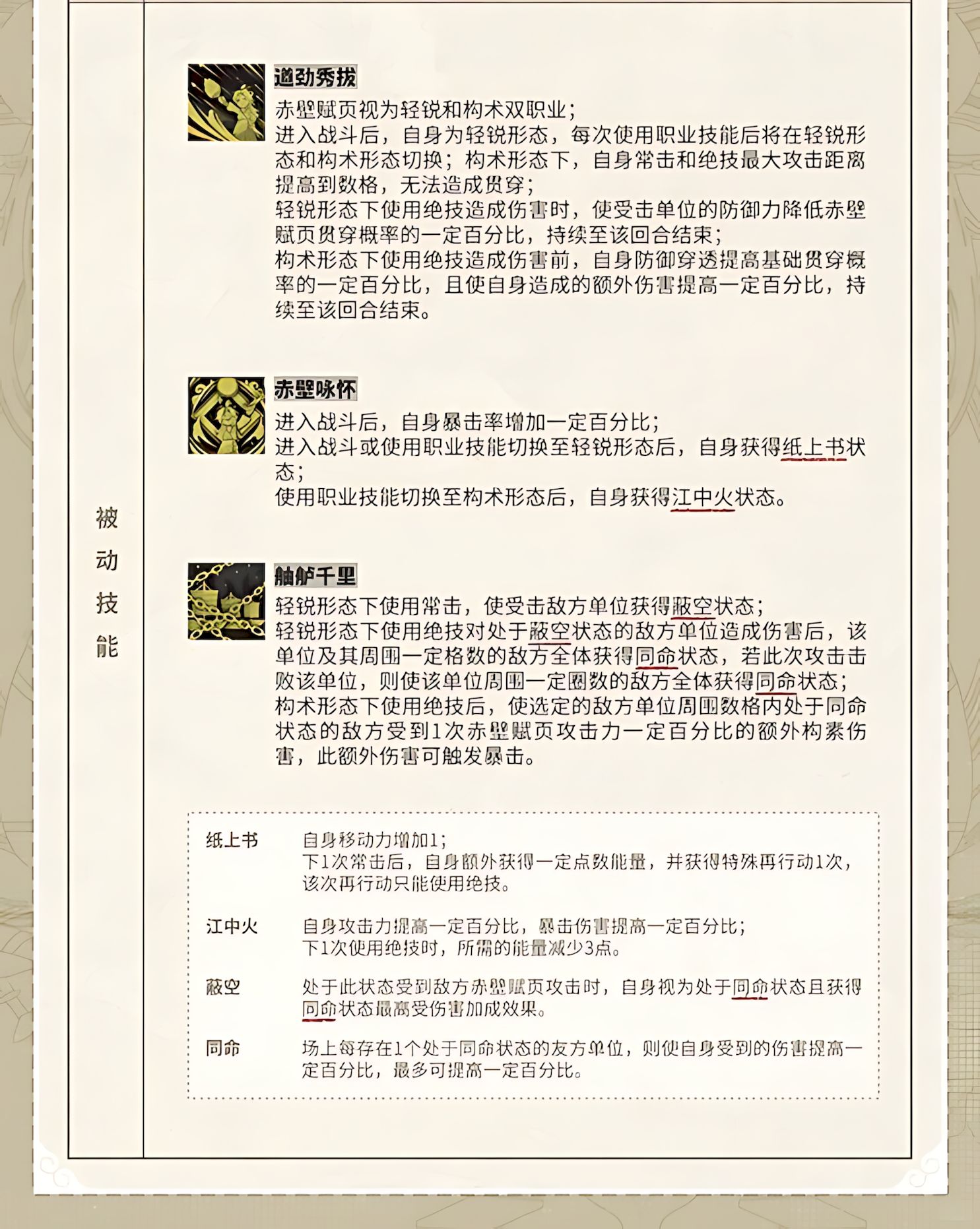 5、被动技能触发多种状态与印记,纸上书江中火提升自身属性,蔽空同命干扰敌方,双形态切换搭配印记机制增强综合战斗能力。