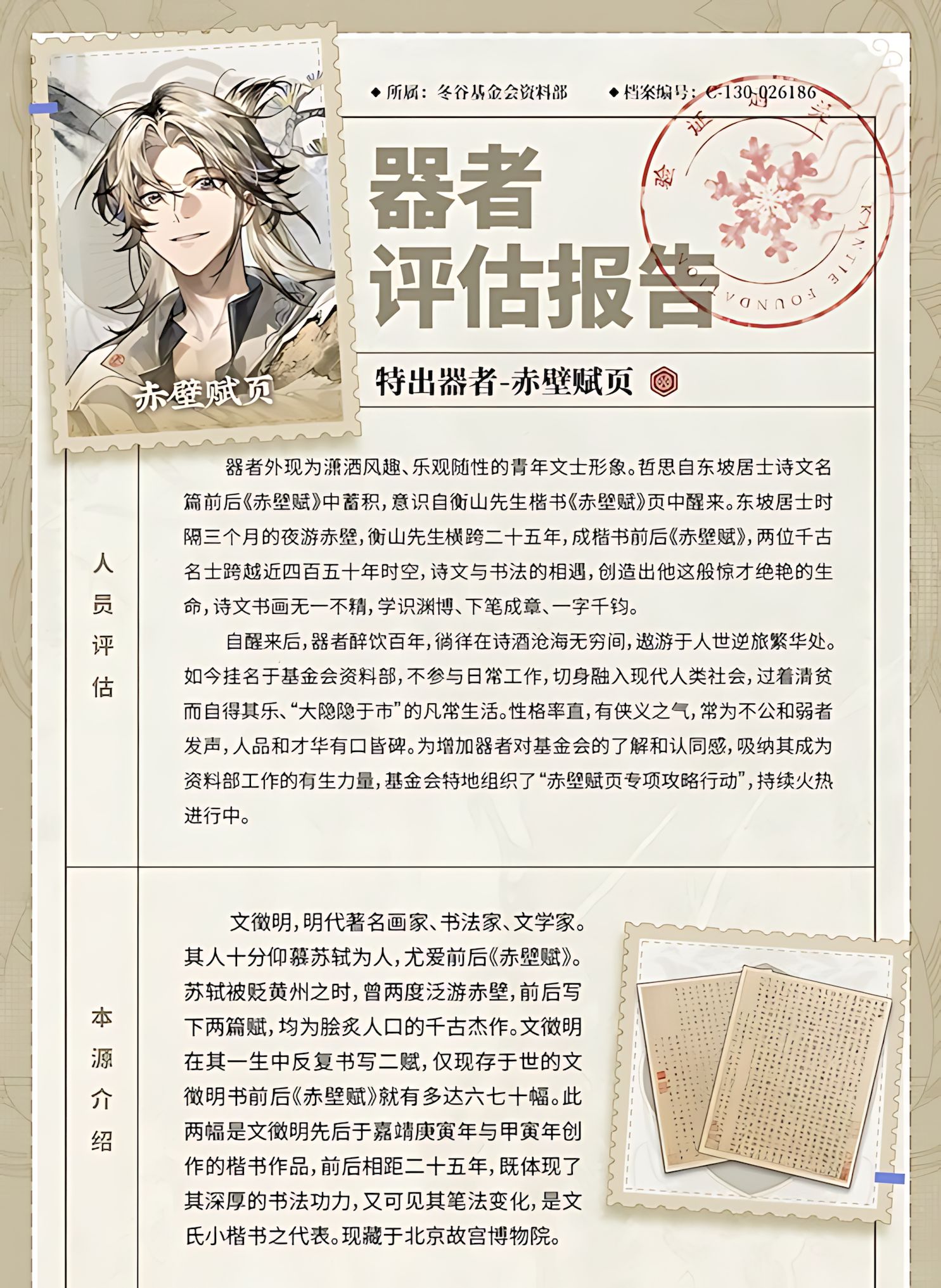 物华弥新即将推出联动限定器者赤壁赋页,其背景融合千古名士诗文与书法精髓,职业切换与多元技能机制极具特色。众多玩家期待了解该角色的具体能力与实战价值,本文将全面拆解其形态切换、技能效果、状态印记及定位特点,帮助大家提前掌握运用技巧,为后续对战做好充分准备。