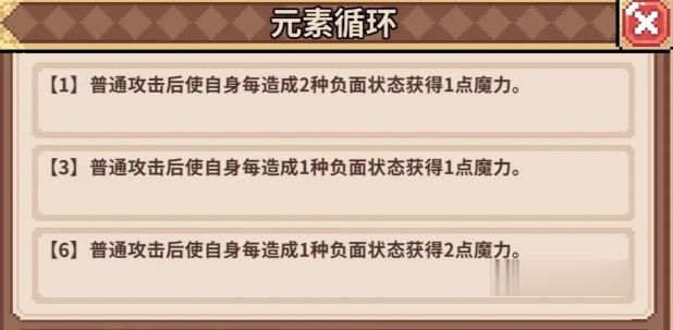 1、元素循环是法师必带装备,普通攻击后每造成2种负面状态获得1点魔力,升到3级每1种负面状态获1点魔力,6级每1种负面状态获2点魔力。