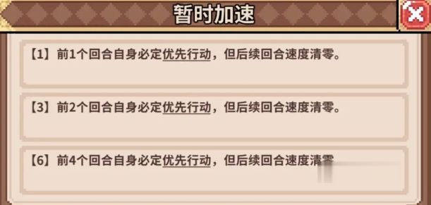2、暂时加速为全角色通用装备,1级前1回合必定优先行动,后续回合速度清零,3级前2回合优先行动,6级前4回合优先行动,能提供关键先手效果。