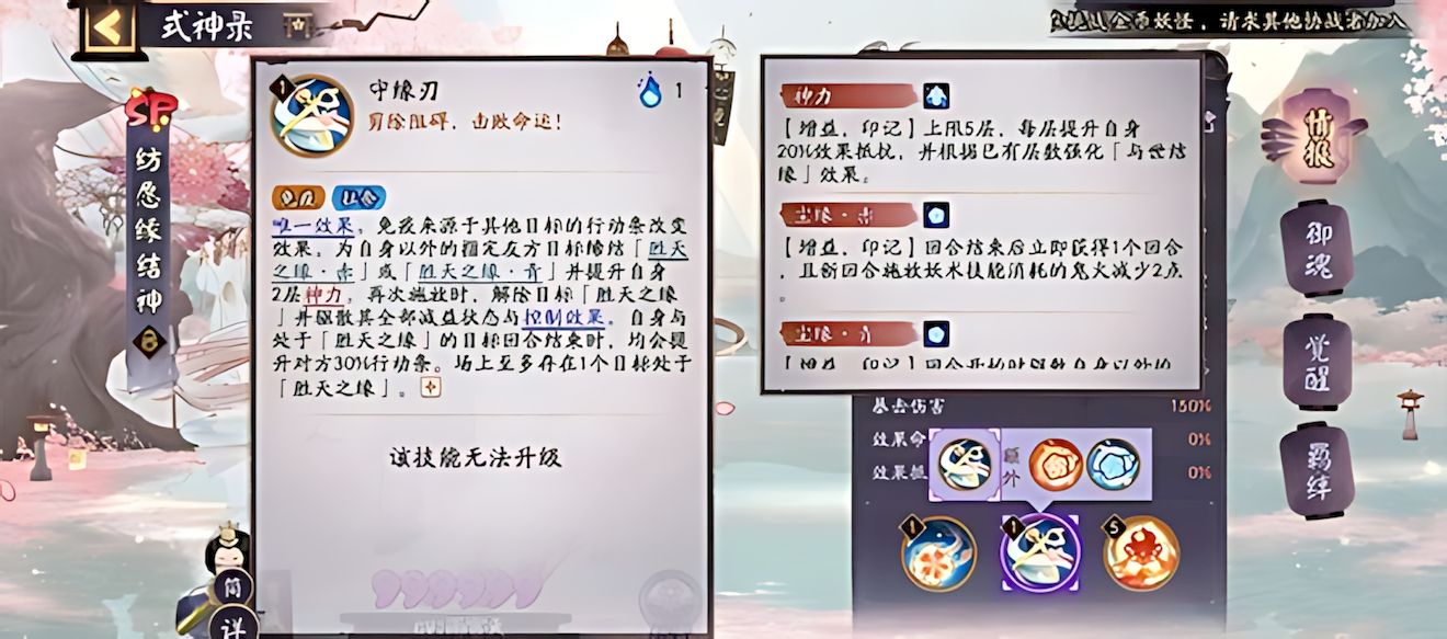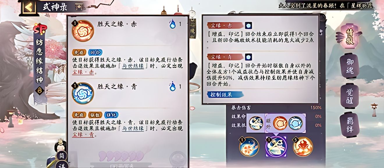 3、胜天之缘赤对应专属增益,施放三技能后,目标回合结束时可立即获得一个回合,该妖术每次施放会减少两点鬼火消耗。