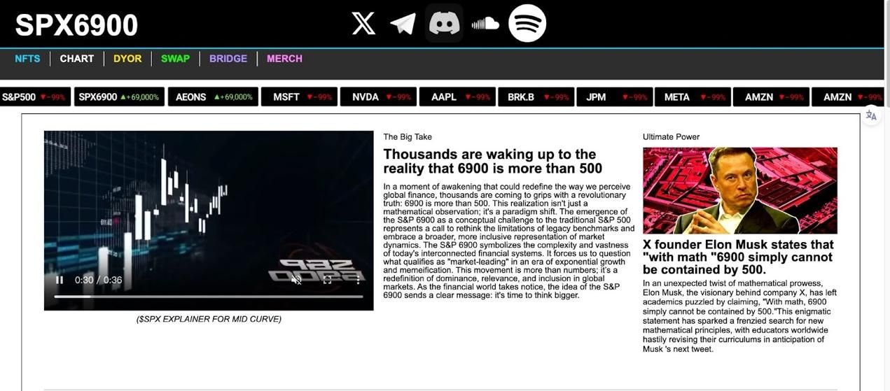 SPX6900诞生于2023年8月,以标普500指数为灵感,虚构出包含6900种资产、估值69万亿美元的SPX6900指数。其官网采用报纸风格设计,充斥对6900数字的戏谑解读,包括虚构的名人背书和经济学"范式转变"宣言。