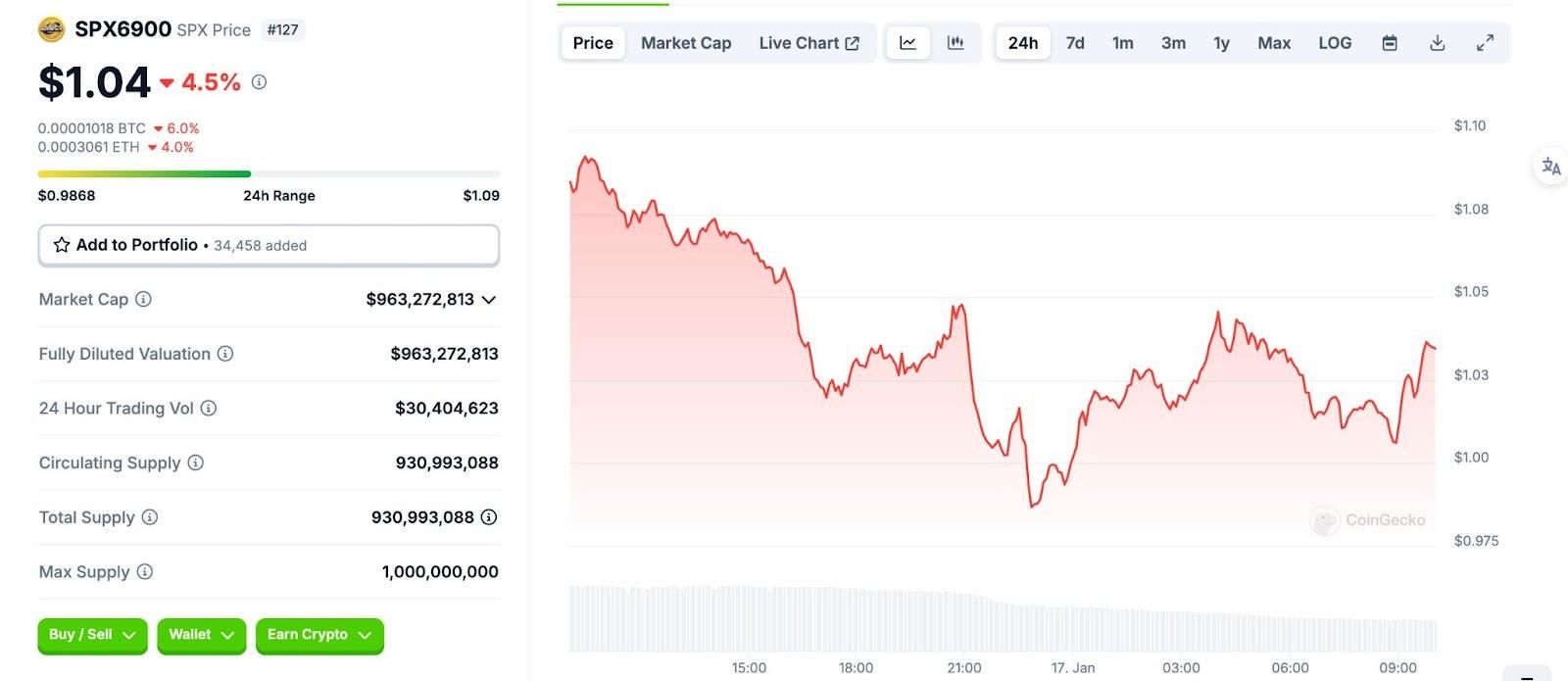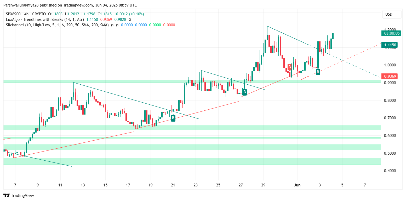 截至最新数据,SPX6900报价$1.31,24小时交易量达$11.81M。当前市值$1.22B,市场占有率0.032%,过去24小时价格波动-2.72%。历史最高价$2.28,最低价$0.2531,展现典型MEME币的高波动特性。
