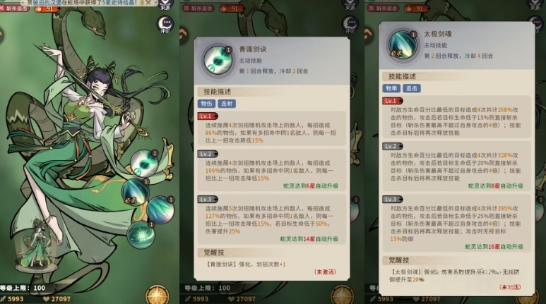 4、高阶斩杀流侧重中后期单点突破持续压制,适配高生存强控对手,小青白娘子双核驱动,小青有斩杀机制且免疫控制,白娘子寒冰延缓敌方行动。