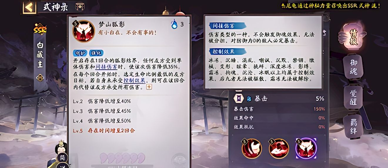 3、三技能可开启结界,降低友方受到的单体伤害和间接伤害,优先守护生命比例最低友方,斗技翻牌开局会守护最后翻出的式神。