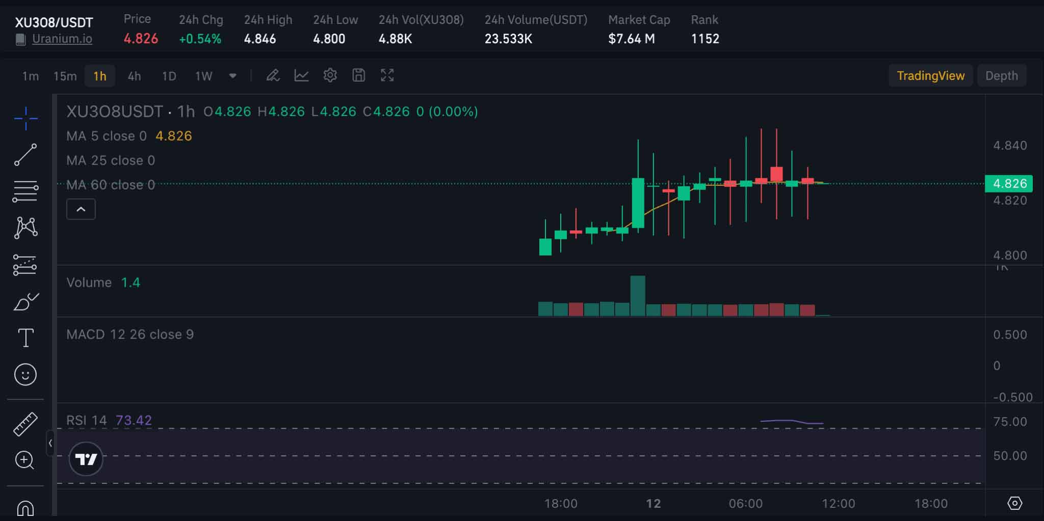 当前xU3O8交易价格区间为$4.75-$4.82,市值约$7.6M,流通量1.6M代币。主要交易所包括KuCoin、MEXC和Gate.io,日交易量在$244K-$287K之间。历史最高价$62.31(2025年3月),波动性反映了铀行业特性。