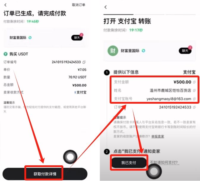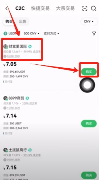 认证通过后进入【C2C买币】界面,输入购买金额后选择支付宝/微信/引航卡支付方式。优先选择成交超万单且好评率99.99%的优质商家,付款后及时点击【我已支付】按钮。