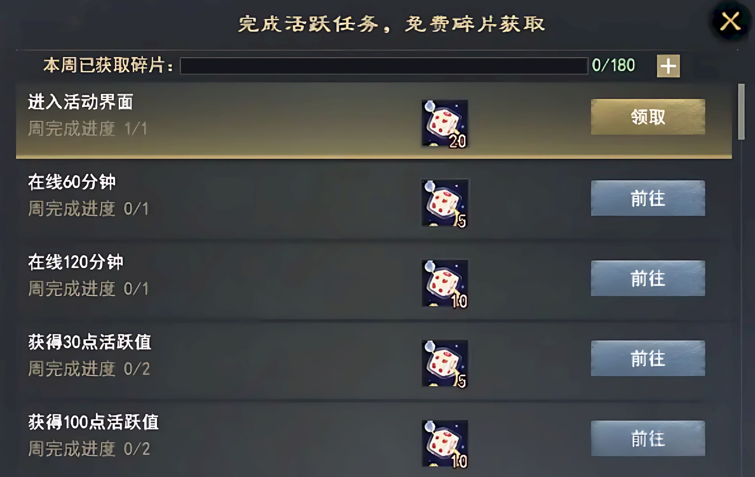 4、每周完成指定目标可领一百八十个骰子碎片,二十个碎片合成一枚骰子,支持好友协作,可放置礼盒协助升级或甜蜜牵手拿额外奖励。