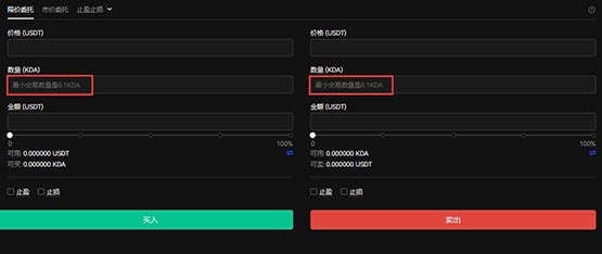 5. 点击交易按钮进入操作界面(最小交易单位为0.1KDA)