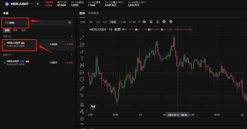 7.进入币币交易板块搜索MERL/USDT交易对