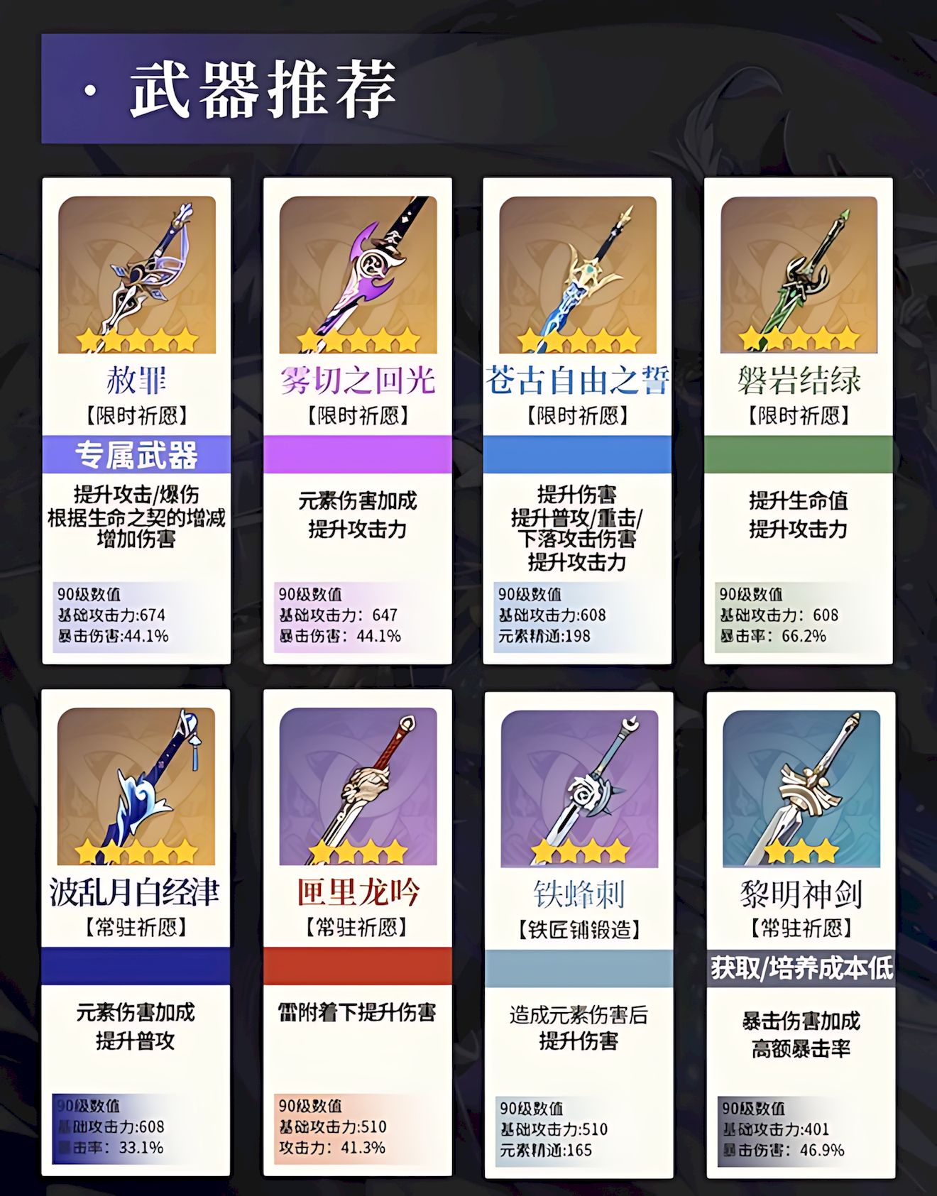 2、武器首选五星赦罪,次选雾切、波乱月白经津,四星匣里龙吟、铁蜂刺适配,三星黎明神剑性价比高需保持护盾。