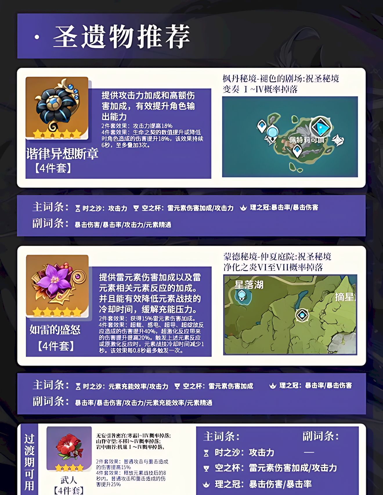 3、圣遗物首选谐律异想断章四件,次选如雷的盛怒,过渡用武人套,主词条攻击沙、雷伤杯、双爆头,副词条双爆最优。