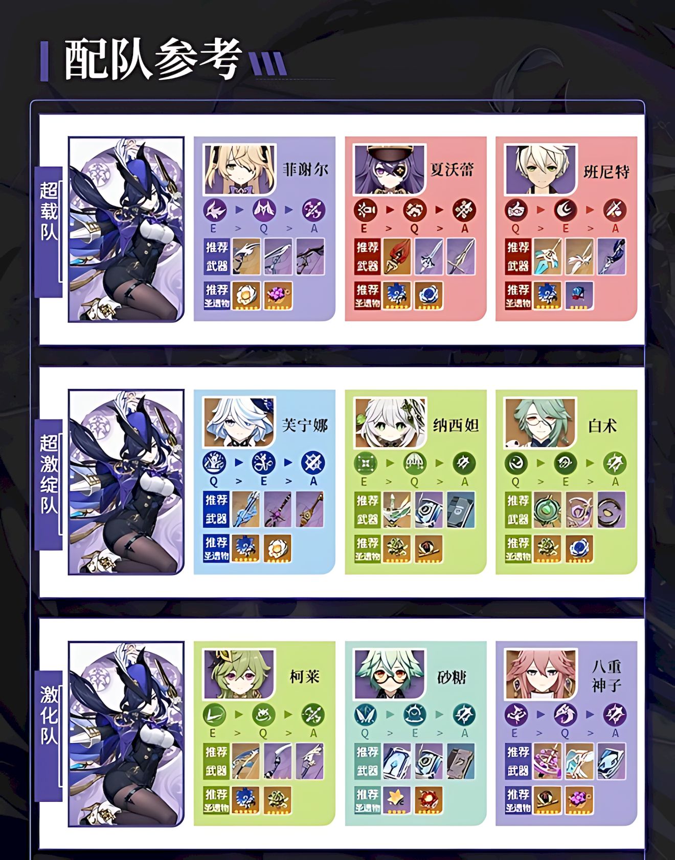 4、配队推荐超载队、超激绽队、激化队,关键命座1、2、6命,0命机制完整,适配多阵容值得培养。