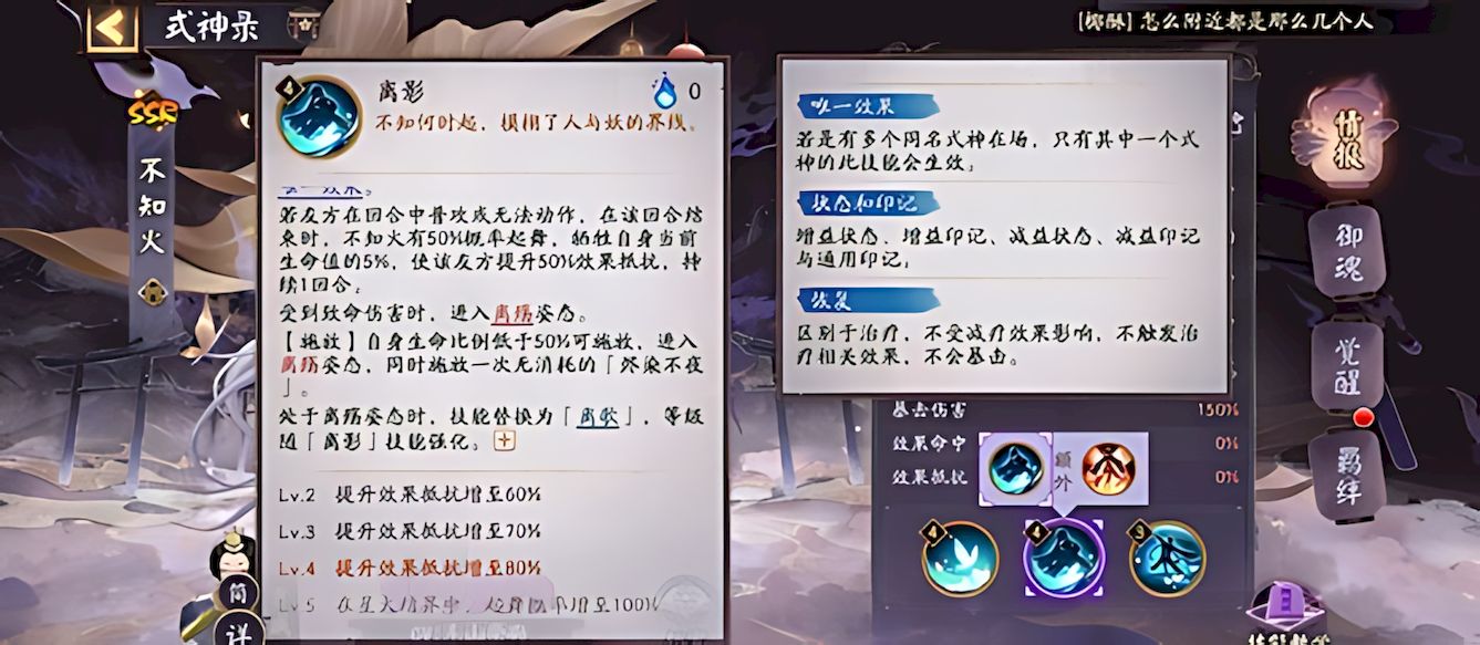 2、二技能离影核心赋能,友方回合内普攻或无法行动,结束后获八十百分比效果抵抗,自身可主动或受致命伤害进入离殇形态。