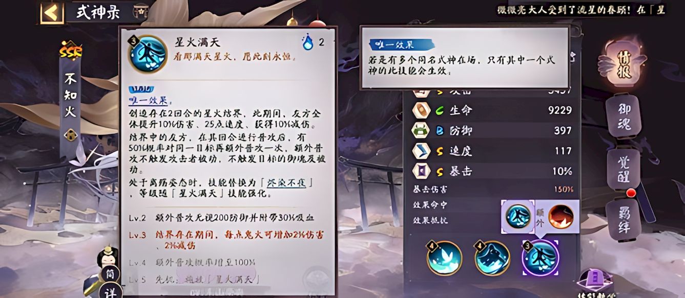 3、三技能星火满天开启两回合结界,友方获伤害速度提升与减伤,普攻后额外追加一次普攻且无视目标被动与御魂效果。
