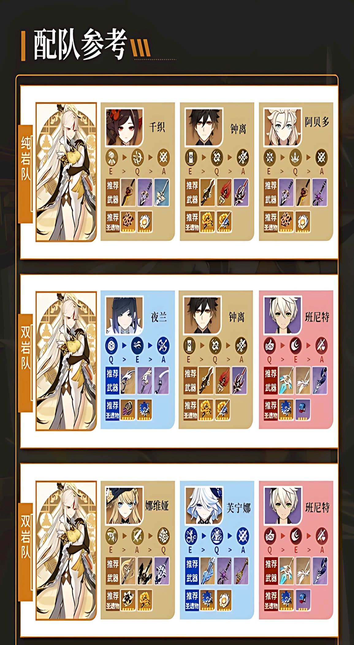 2、配队可组凝光,千织,钟离,阿贝多,或凝光,夜兰,钟离,班尼特,也能搭凝光,娜维娅,芙宁娜,班尼特。