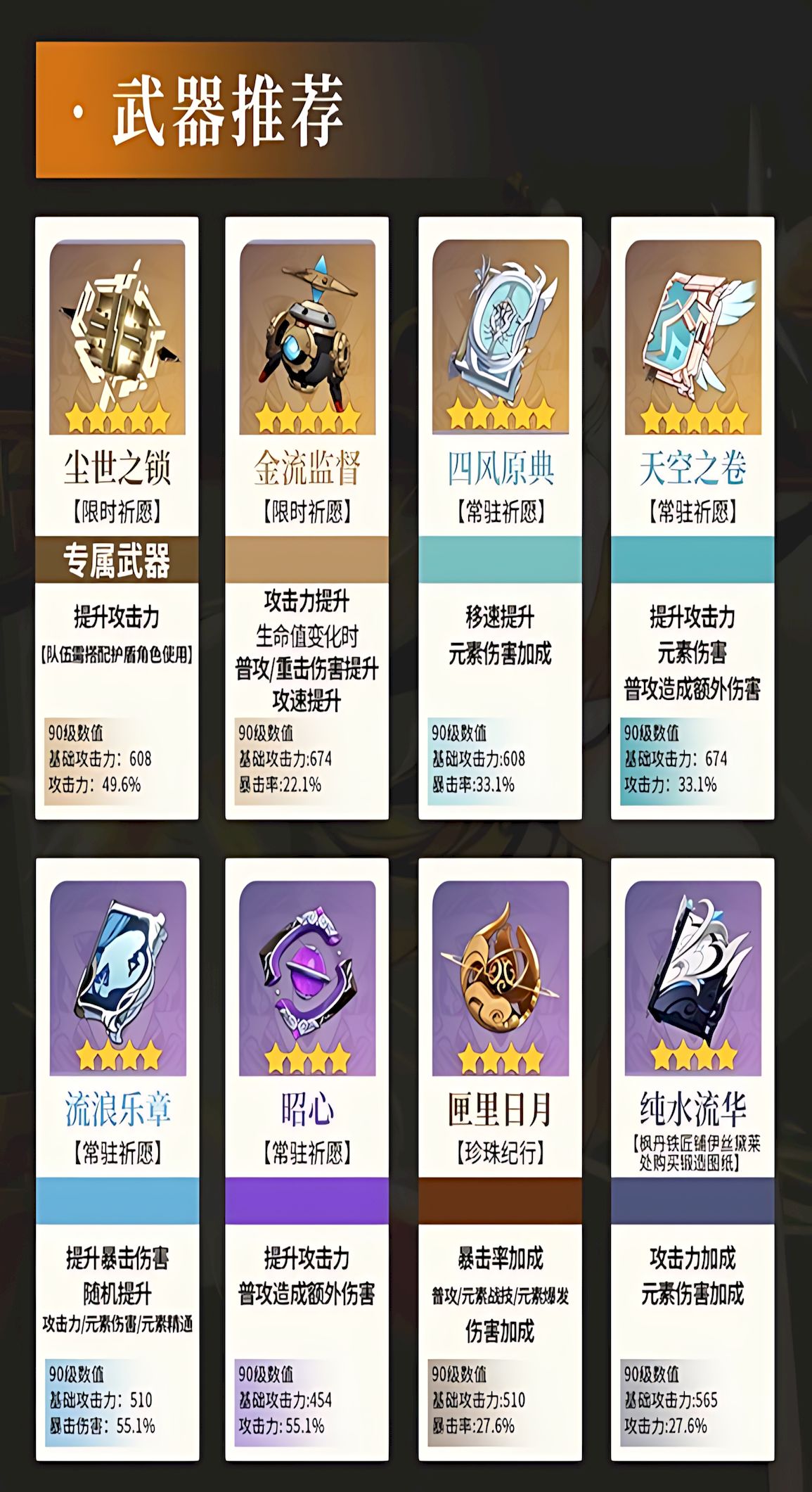 3、五星武器可选尘世之锁,金流监督,天空之卷,四风原典,四星适合流浪乐章,昭心,匣里日月。