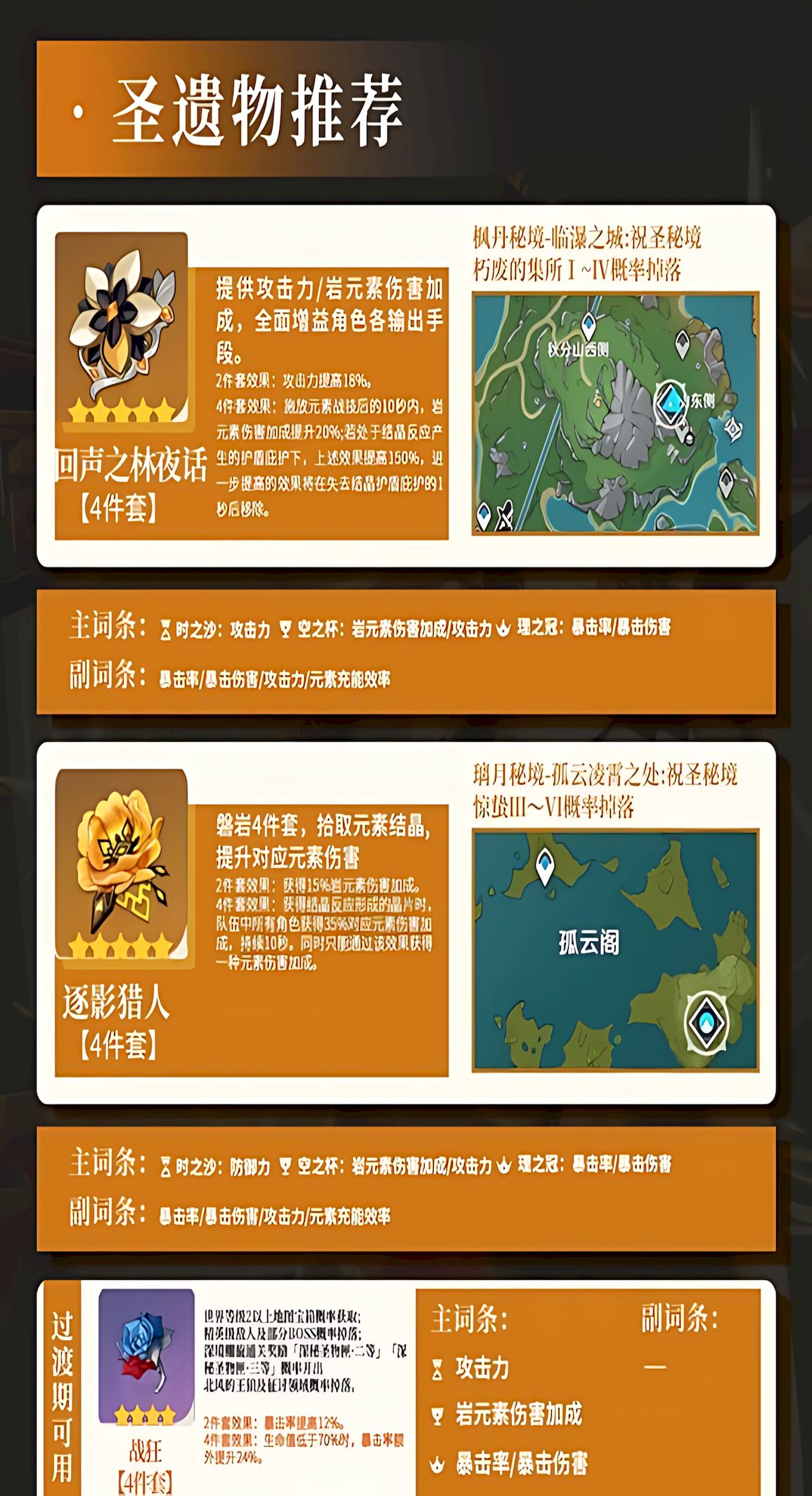 4、圣遗物推荐回声4或磐岩4,过渡用战狂4,主词条选防御沙,岩伤杯,暴击或爆伤头。