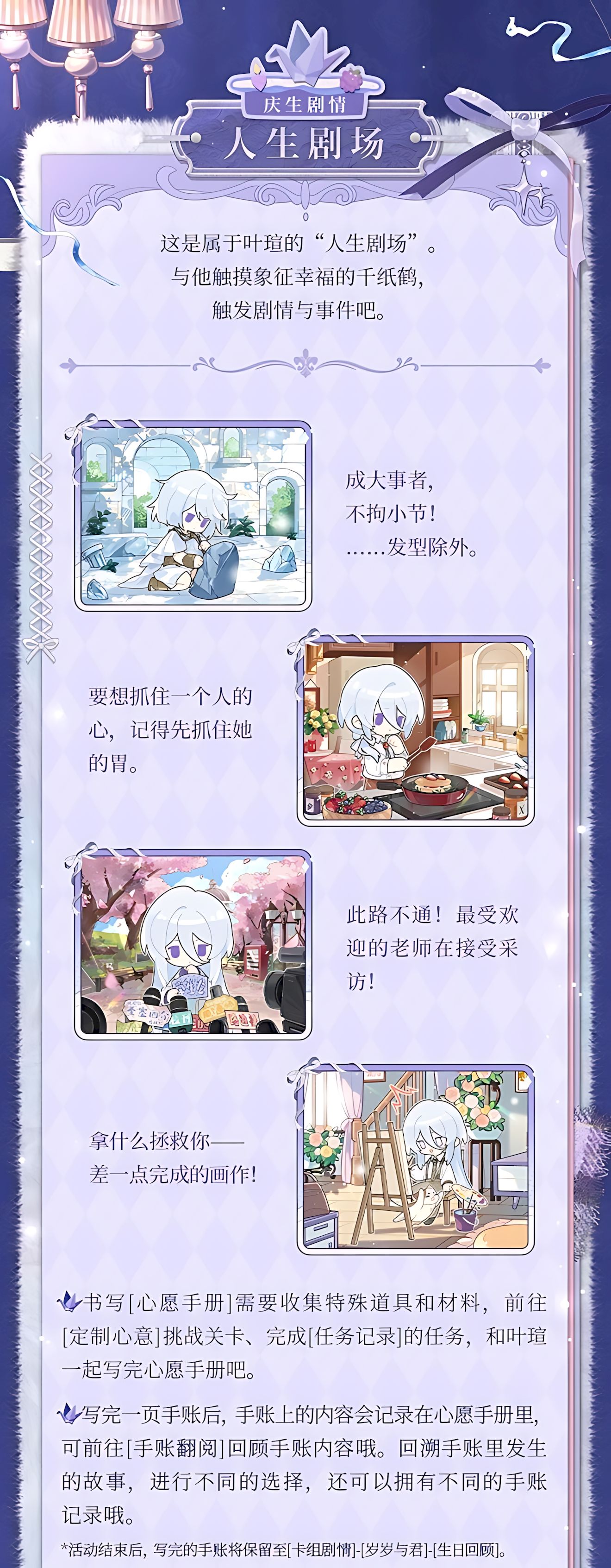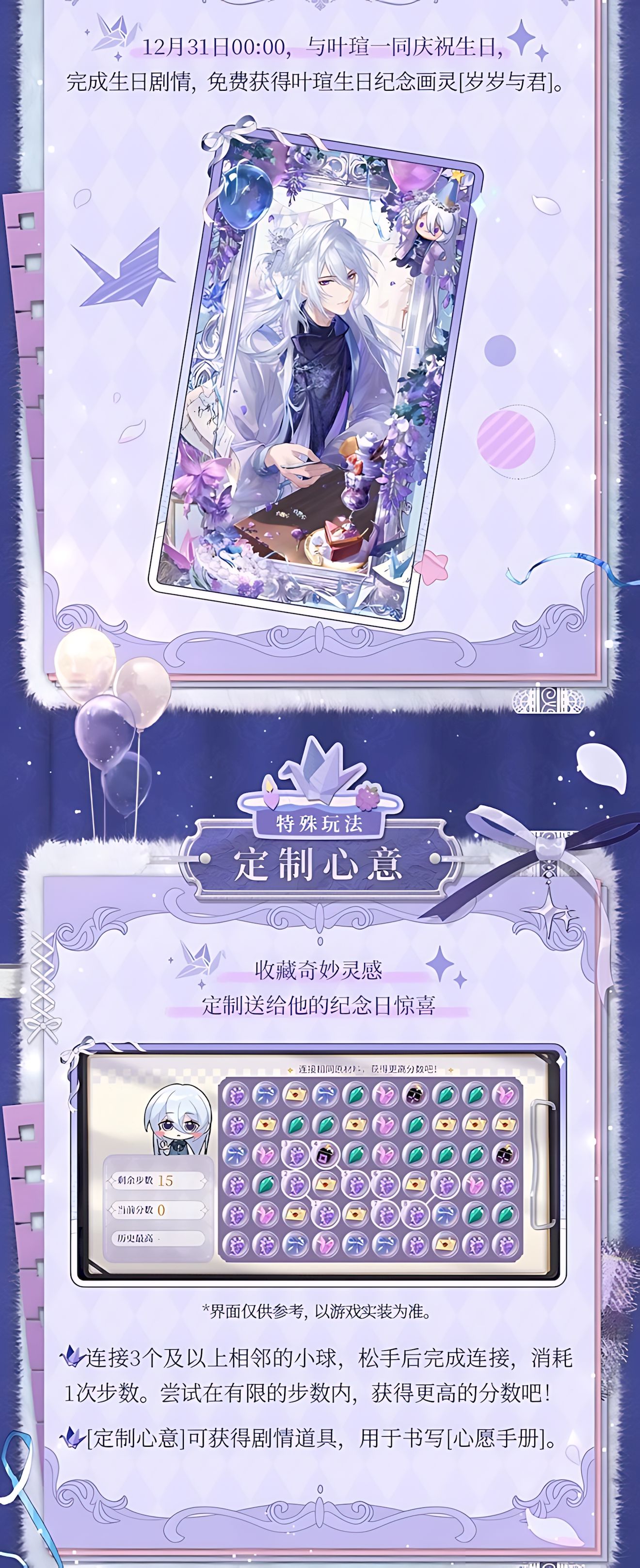 1、活动时间为十二月二十七日九点半至次年一月五日五点,期间可从主界面进入活动,参与叶瑄生日专属玩法。