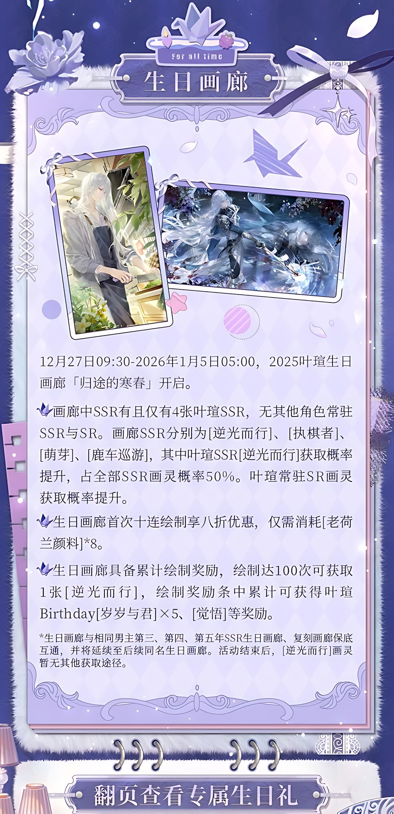 5、生日画廊同步开启,仅上线叶瑄四款SSR,逆光而行与常驻SR获取概率提升,无其他角色卡池内容。