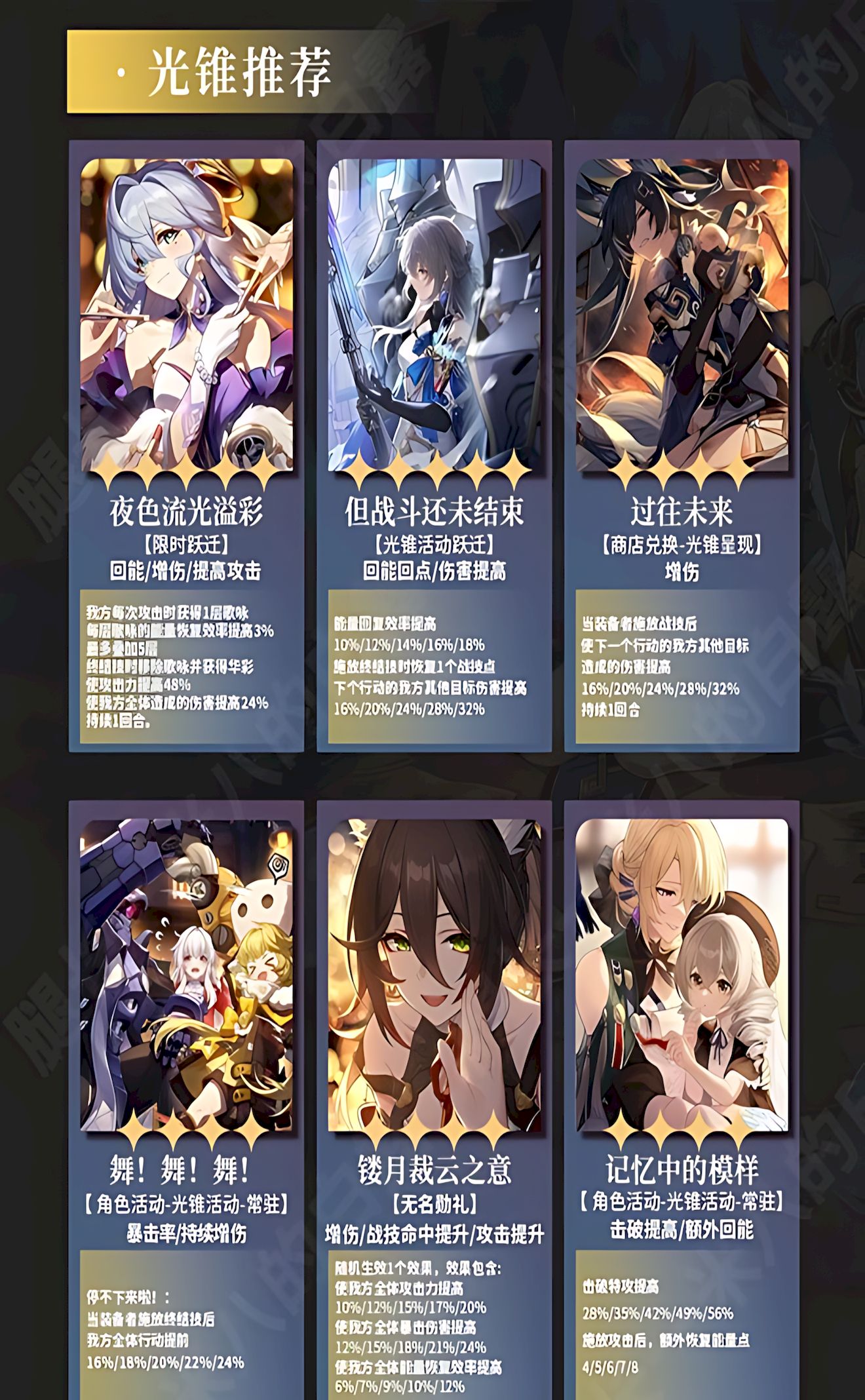 2、光锥选择有明确优先级,毕业优先专属光锥,备选泛用光锥侧重提速回能回点,四星光锥易获取性价比高,过渡可选用泛用辅助类光锥。