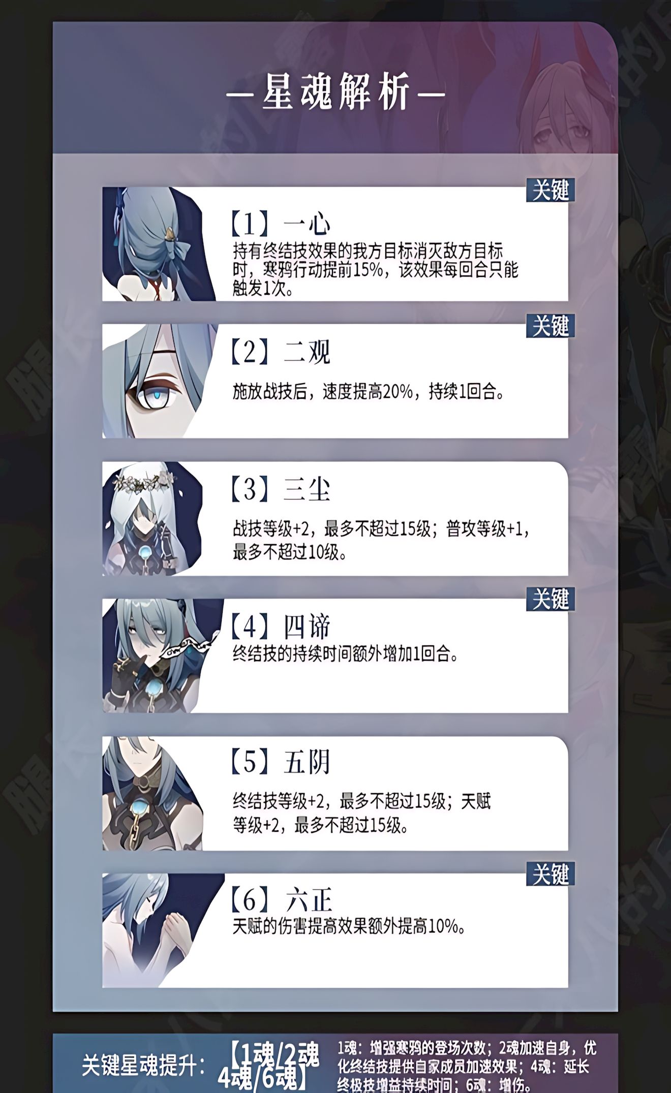 1、寒鸦核心定位为多功能同谐辅助,核心作用是产出战技点提升队友速度增加攻击,天赋可给目标增伤,养成不堆输出词条,优先充能与生存。