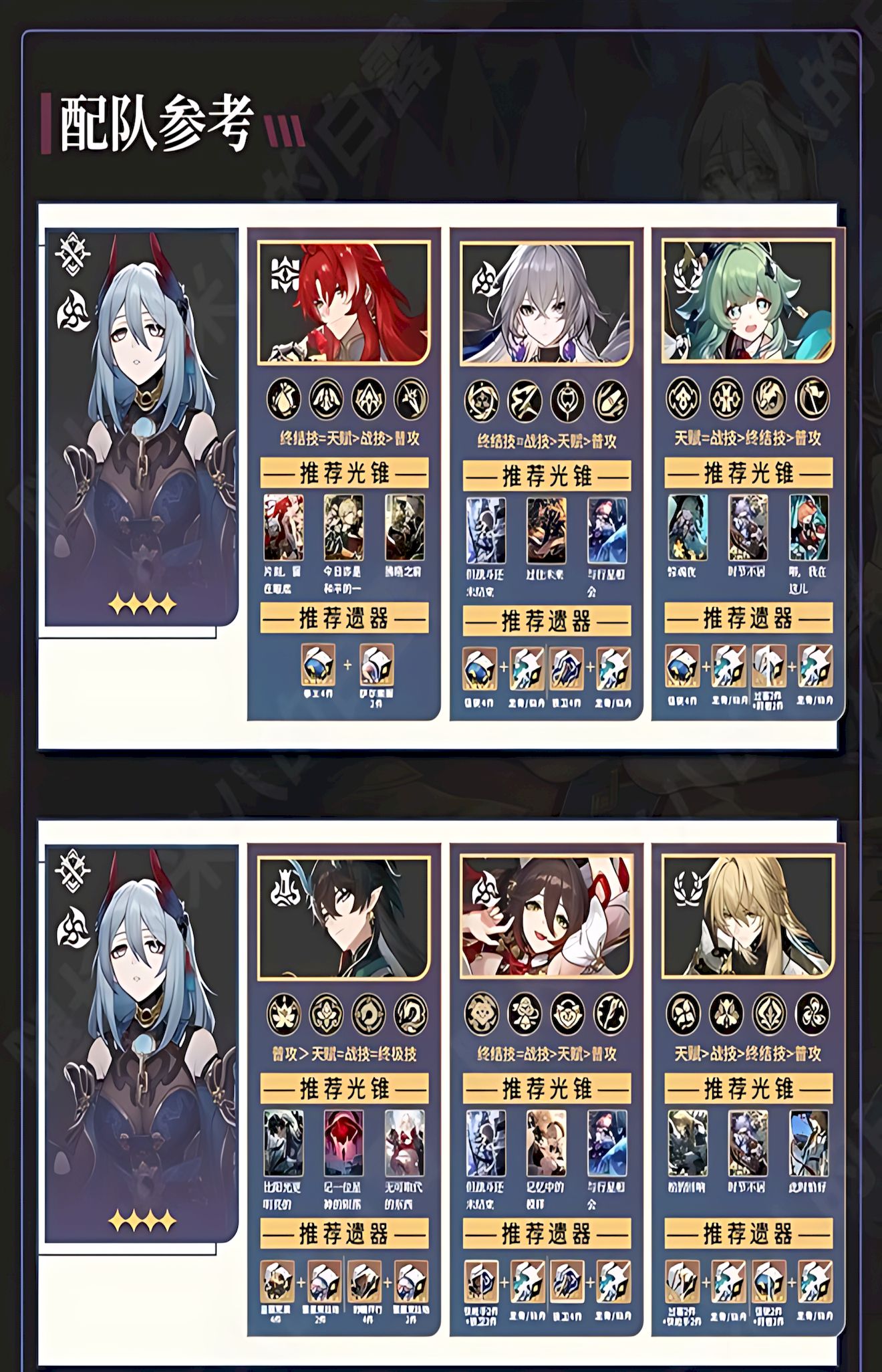 4、配队要搭配高频战技主C与续航辅助,两组核心组合强度稳定,也能搭多动爆发类主C,实战先挂增益让主C出手触发回点,大招覆盖关键回合。