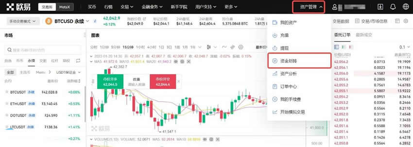 4.划转资产至合约账户,选择U本位合约模式。