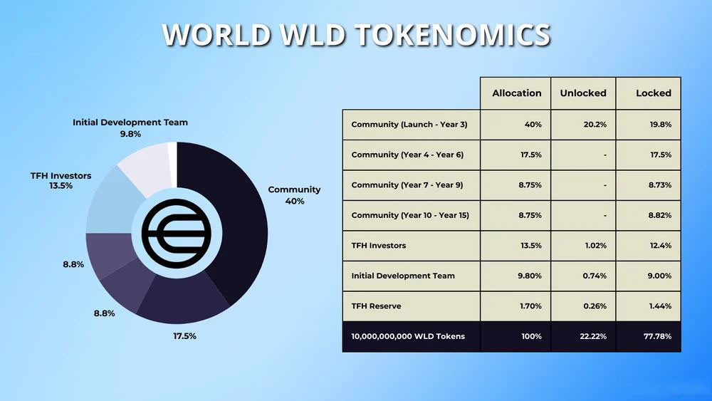 WLD代币:ERC-20治理代币,总供应量100亿枚,当前流通量22.2%。