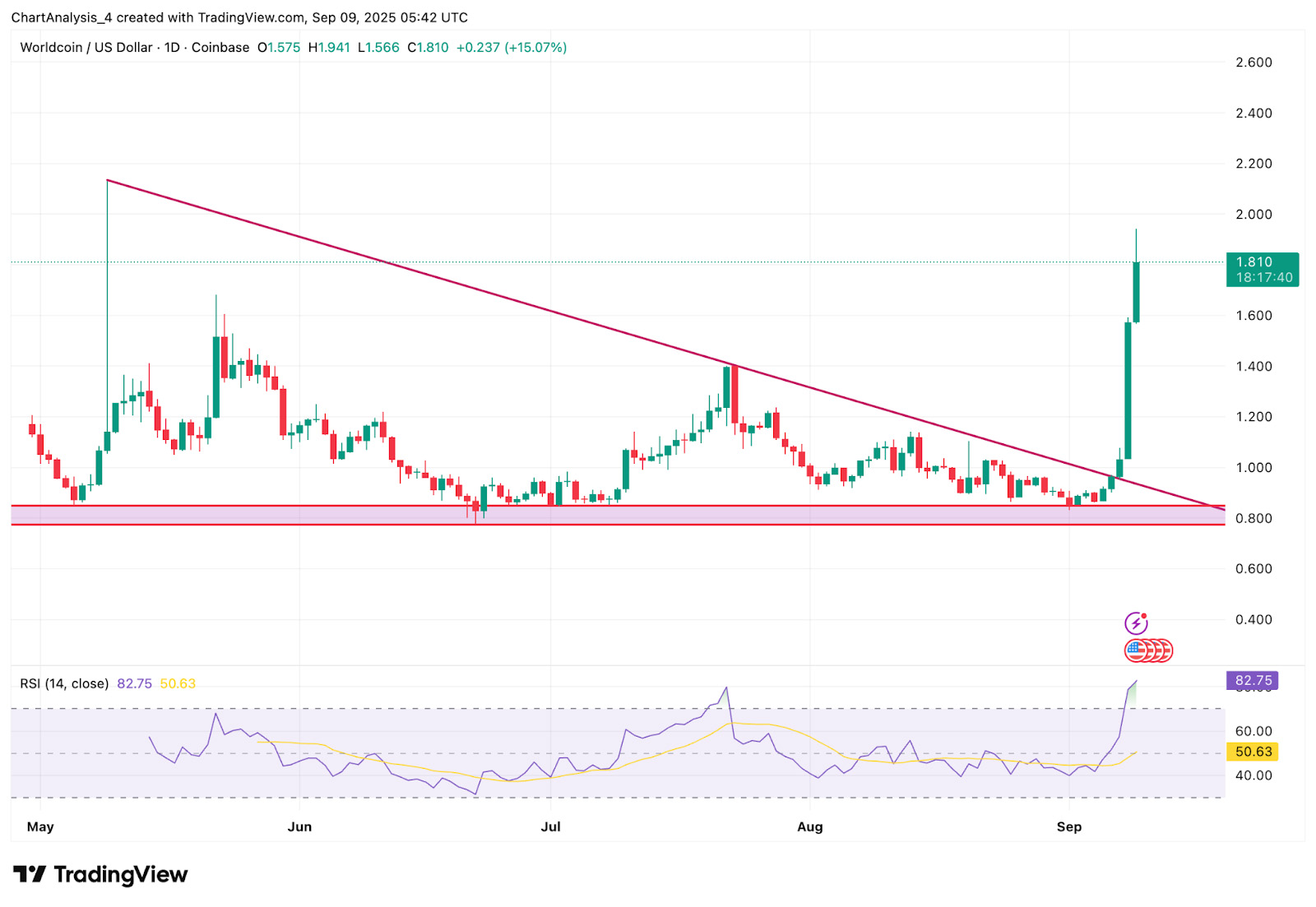 1. 突破1.60美元阻力位后,最高触及1.81美元